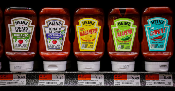 Heinz Ketchup products sit on a supermarket shelf in New York City, U.S., August 22, 2025, REUTERS/Jeenah Moon/File Photo Purchase Licensing Rights , opens new tab