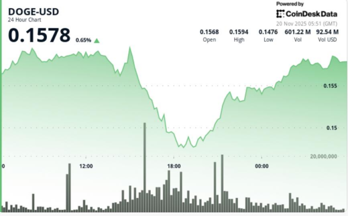 Dogecoin plunged 7.42% during the 24-hour session, collapsing from $0.160 to $0.149 in a breakdown that shattered the critical $0.155 support that anchored the previous consolidation range. Volume jumped 18.39% above weekly averages, confirming institutional participation rather than retail panic.