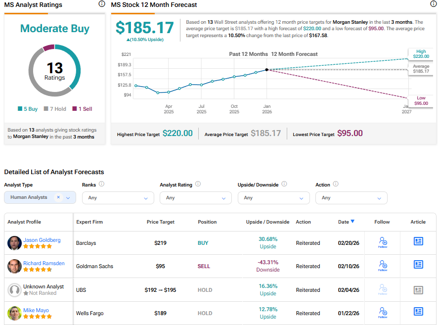 Turning to Wall Street, MS stock has a Moderate Buy consensus rating based on five Buys, seven Holds, and one Sell assigned in the last three months. At $185.17, the average Morgan Stanley stock price target implies a 10.5% upside potential.