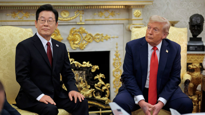 WASHINGTON, DC – AUGUST 25: U.S. President Donald Trump (R) and South Korean President Lee Jae-myung talk to reporters before an Oval Office meeting at the White House on August 25, 2025 in Washington, DC. During Lee’s first official visit to the Whi… [1704 chars]