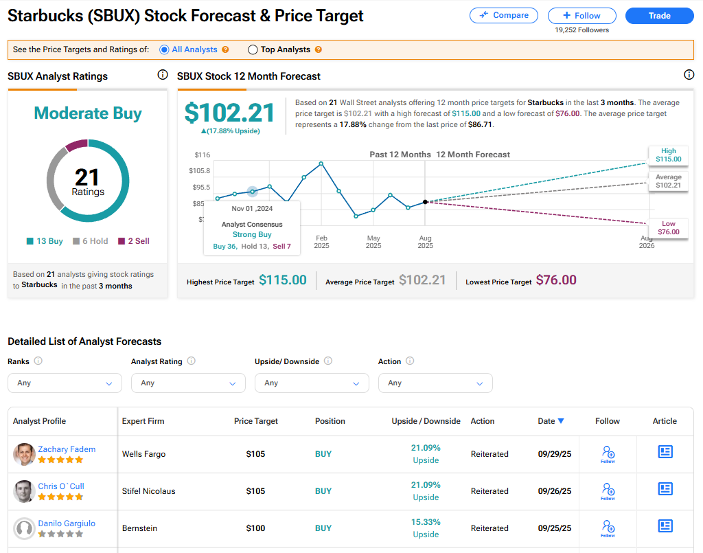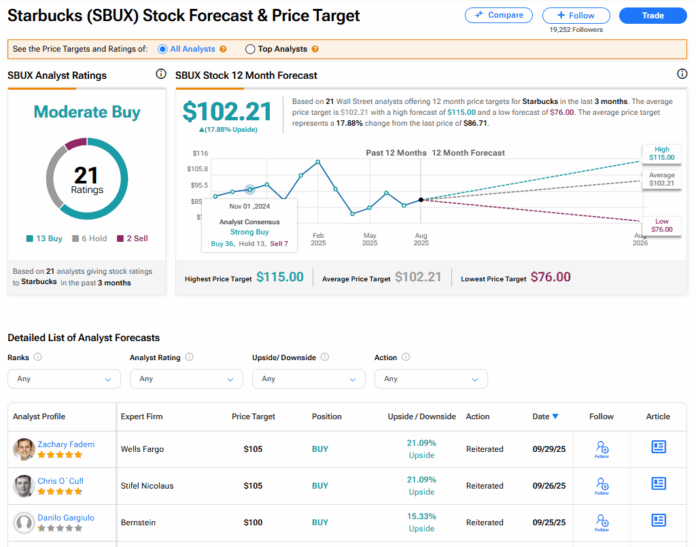 The stock of Starbucks has a consensus Moderate Buy rating among 21 Wall Street analysts. That rating is based on 13 Buy, six Hold, and two Sell recommendations issued in the last three months. The average SBUX price target of $102.21 implies 17.88% upside from current levels.